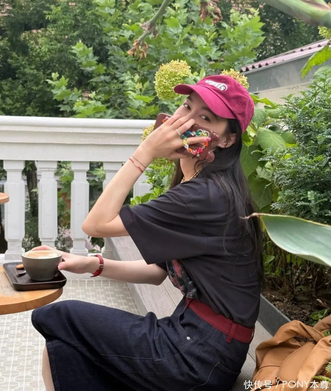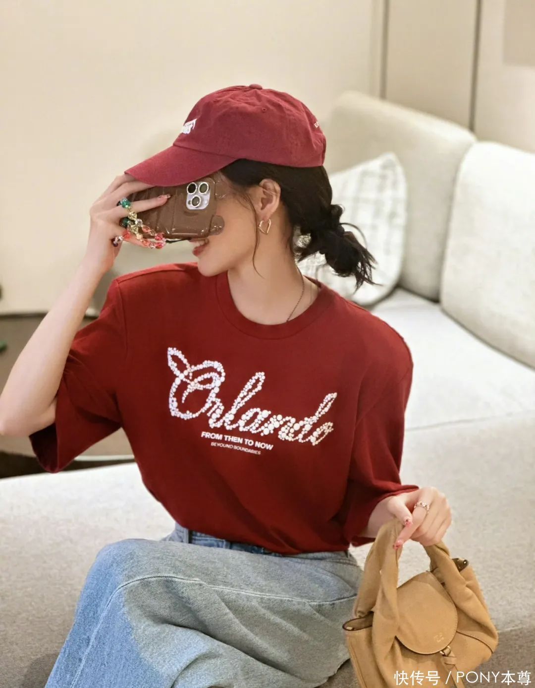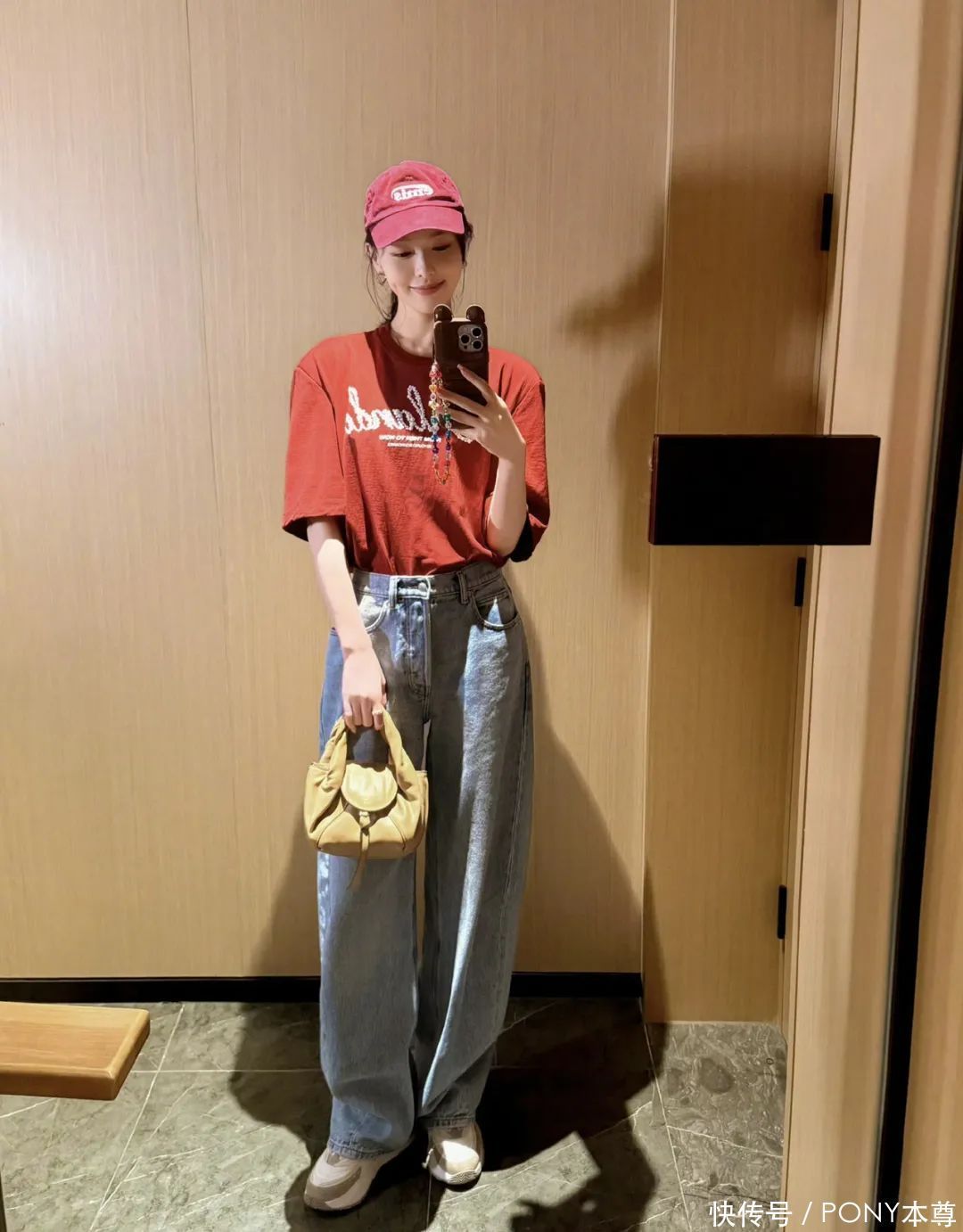 红色T恤搭配蓝色牛仔裤被唐嫣独霸出很日常的嗅觉!搭配酒红色棒球帽和低扎马尾,日常穿显白不突兀。