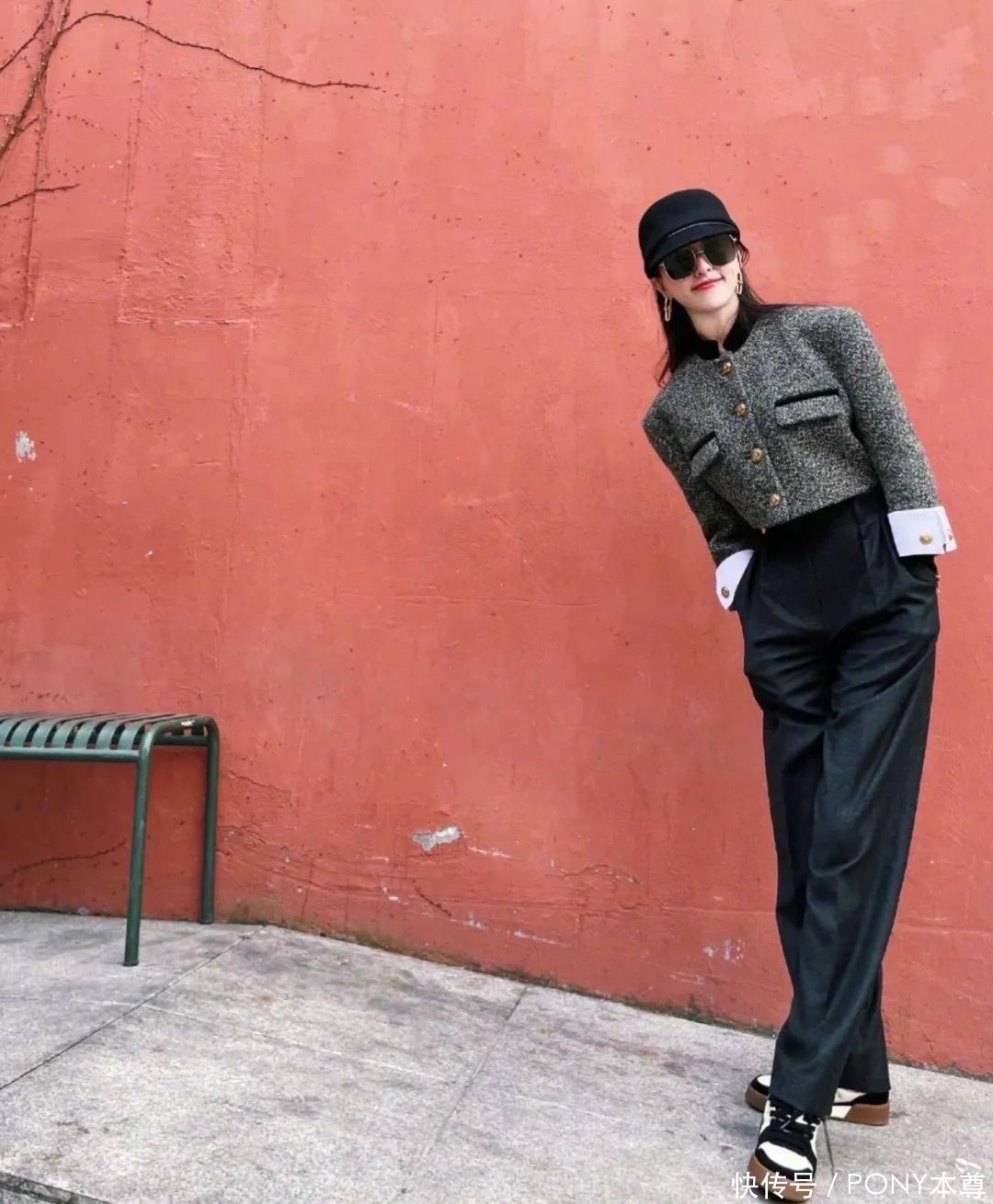 短款拼色毛呢外衣,搭配玄色高腰裤,搭配玄色贝雷帽,洋气高等!