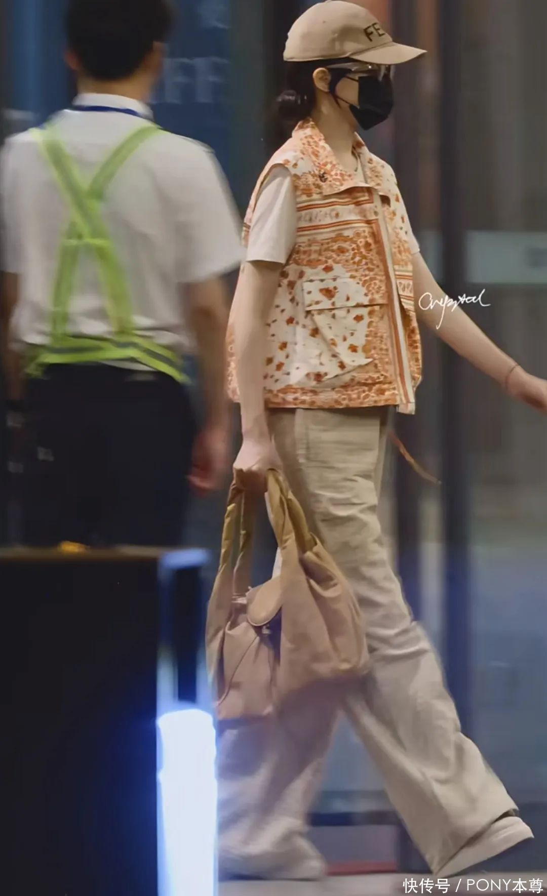 雷同是地面色的搭配,白色T恤搭配印花马甲背心和卡其色直筒裤和厚底小白鞋,和煦减龄。