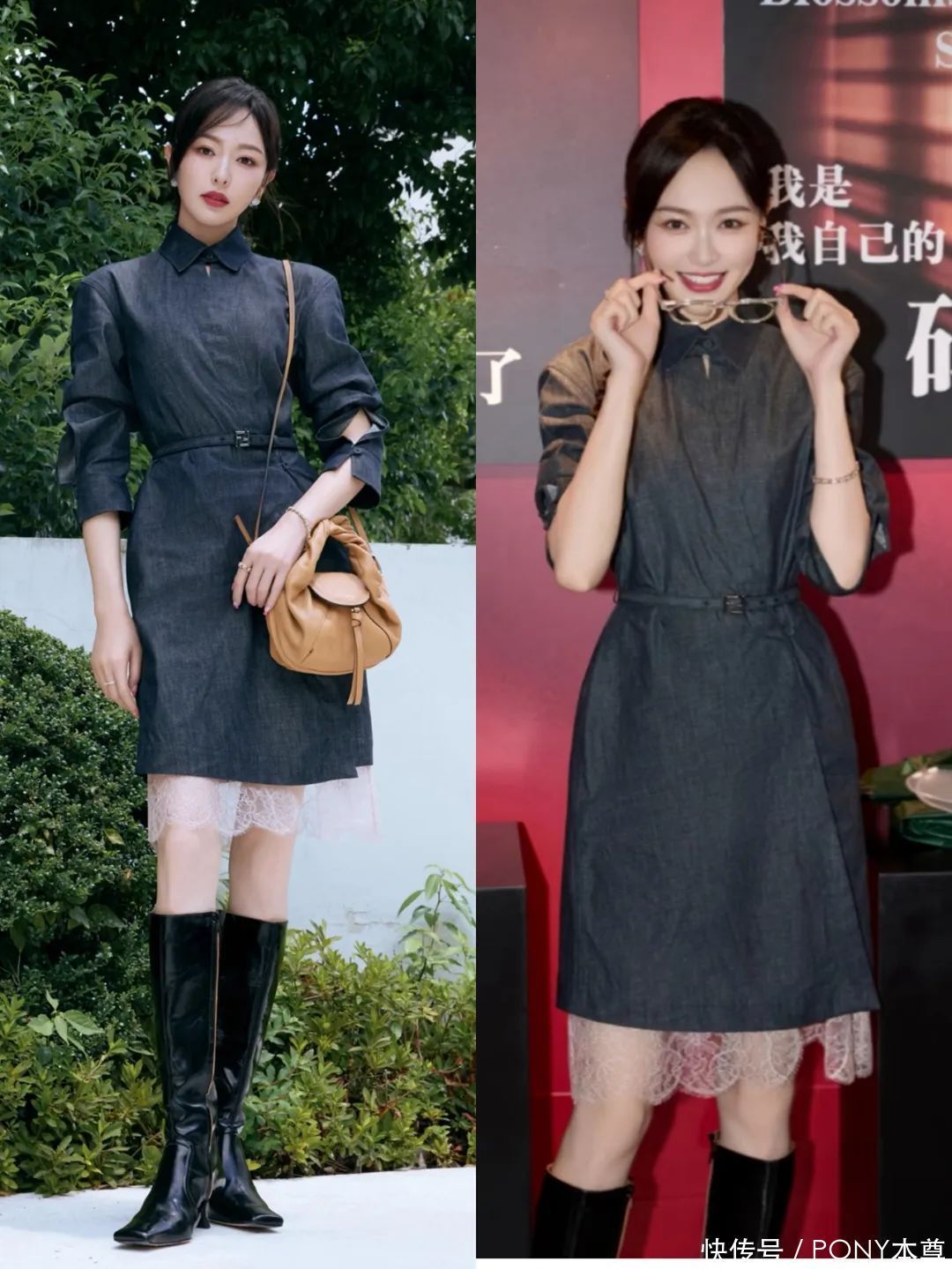 牛仔短款蓄意的连衣裙,搭配粉色蕾丝花边的半身裙,唐嫣的这种搭配御姐范儿透彻。