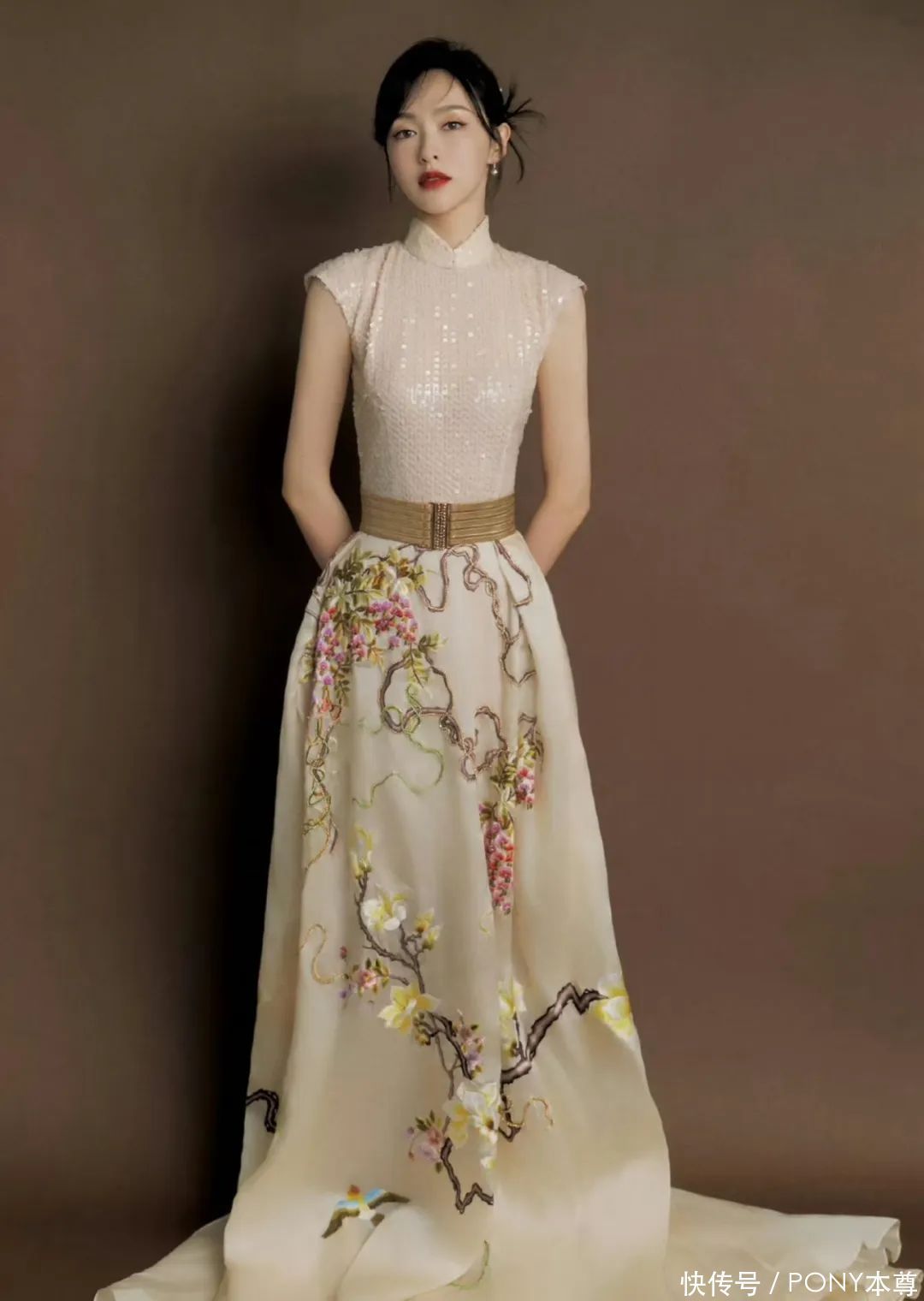 底下这套杏色亮片立领小飞袖蓄意的新登科上衣搭配米白色印花国风半身裙,搭配古典发型和发簪,古典气味让东说念主沦落!